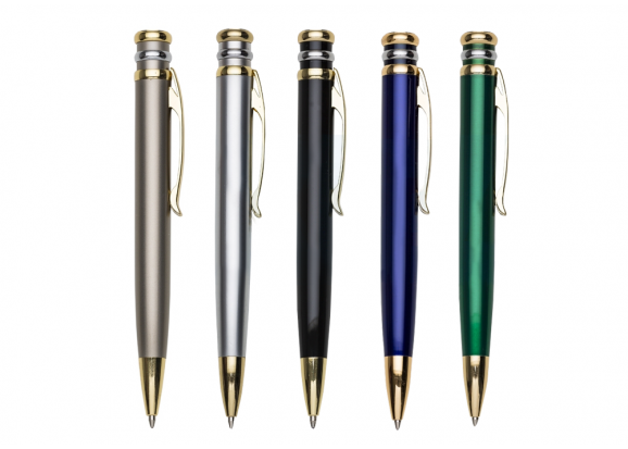 | Características | • Caneta revestida em Metal • 3 Anéis na parte superior • Acionada por giro • Clip metal |