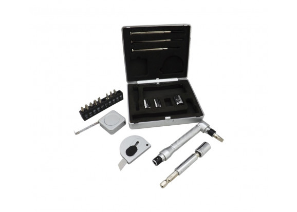 | Características | • 3 mini chaves de fenda • 1 Trena 1 metro • Conjunto com 10 pontas • 4 chaves phillips • 2 chaves fenda • 3 chaves torx e um adaptador • 4 extensores bocais(7MM, 8MM, 9MM e 10MM) • 1 Ferramenta auxiliar • 1 Chave que alonga ferramenta. |