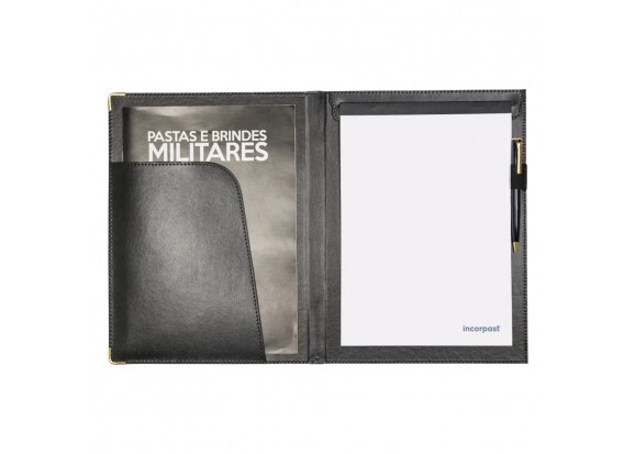 | Características | • Produto Artesanal Fabricado no Brasil • Revestimento em Couro Sintético • Costurado • Bolsa Interna • Suporte para bloco • Suporte porta caneta • Cantoneira de metal |