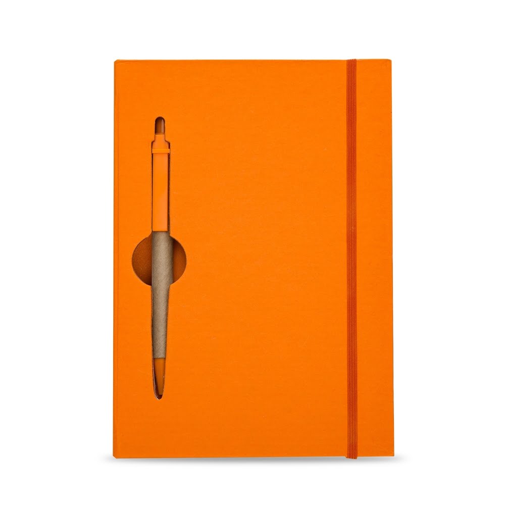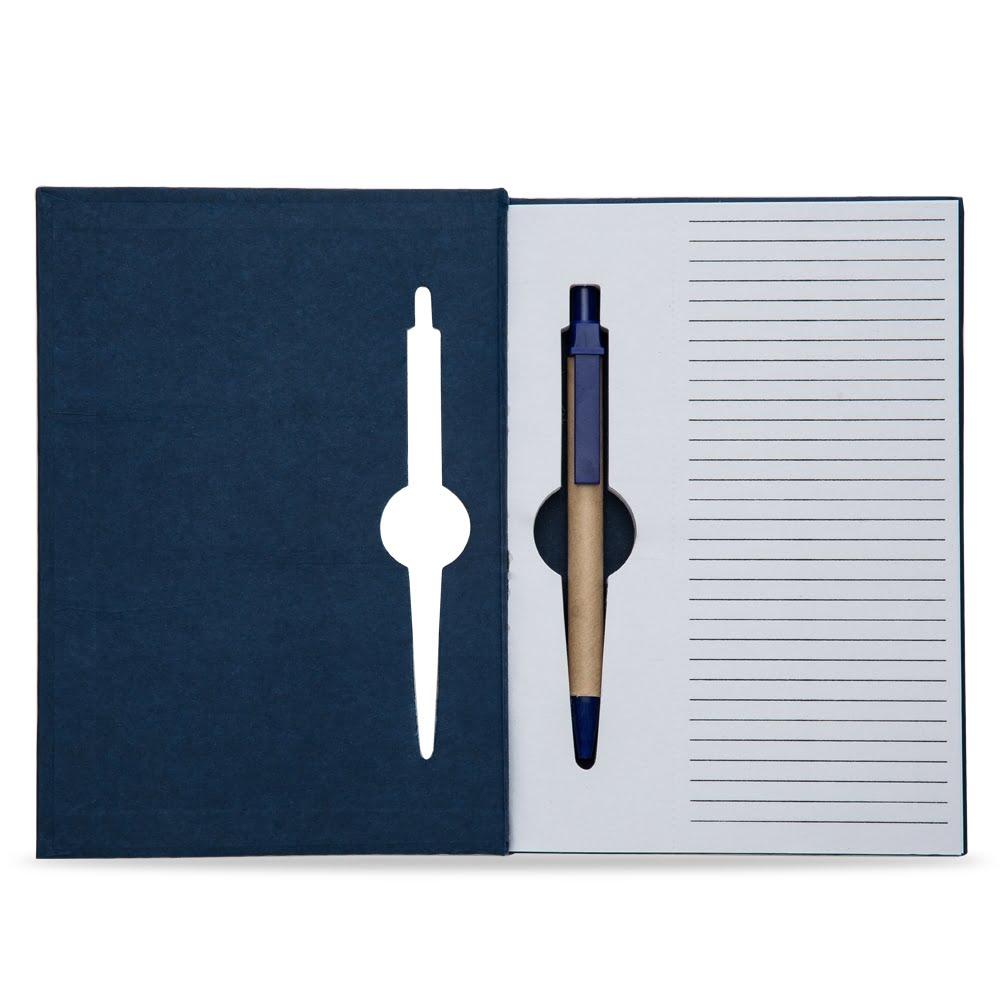 Bloco de Anotações com Caneta Ecológica possui aproximadamente 120 folhas pautadas. Com capa e miolo vazados, utilizados como suporte para a caneta, bloco com miolo de picote, elástico para lacre e caneta de papelão com detalhes plásticos, carga esferográfica na cor azul e acionamento por clique.