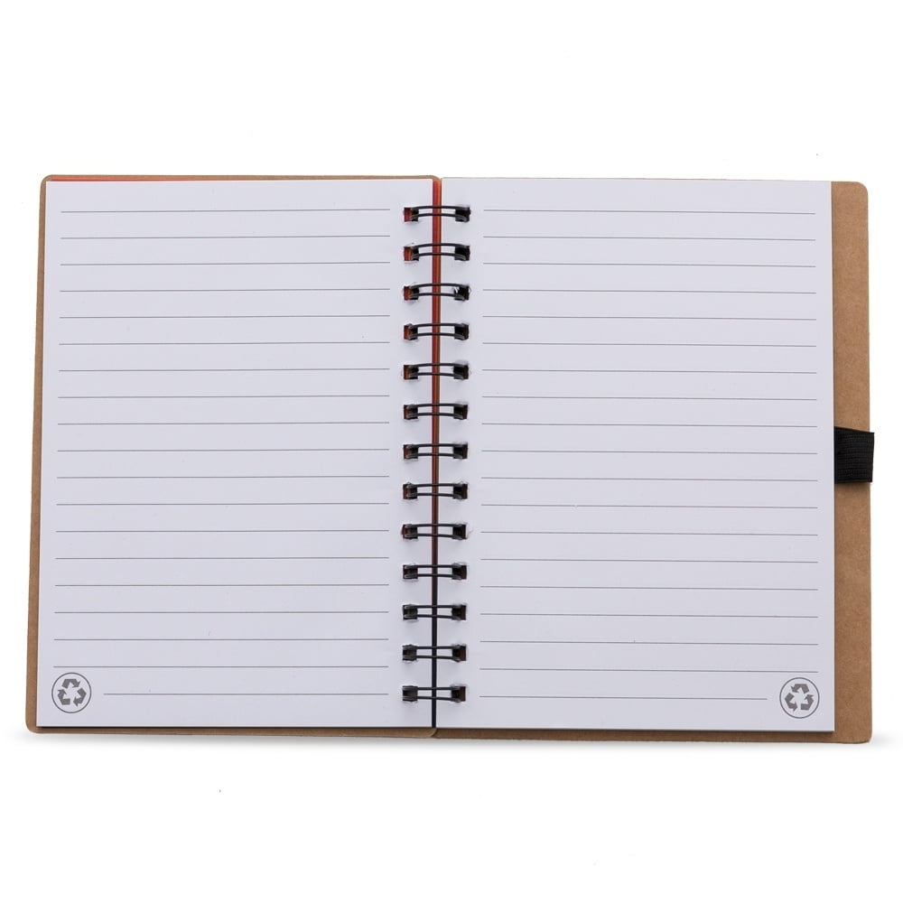 Bloco de Anotações Kraft Ecológico possui aproximadamente 70 folhas brancas pautadas, logo reciclado na capa. Possui elástico para suporte de caneta. Acompanha as folhas: vermelha, amarela, laranja, azul, verde e preto, possibilitando deixar a cor desejada como fundo do símbolo reciclado.