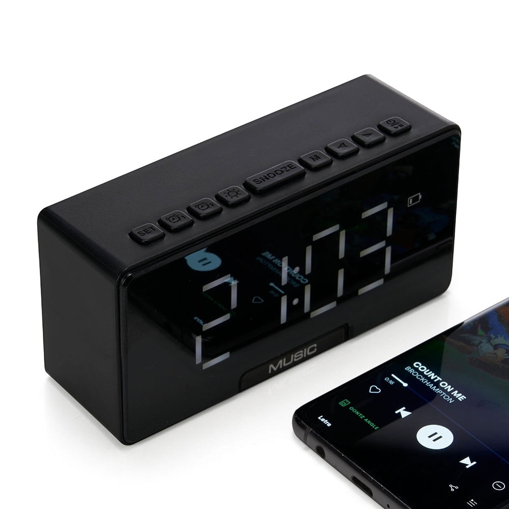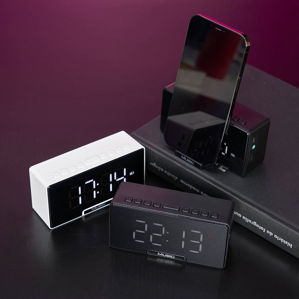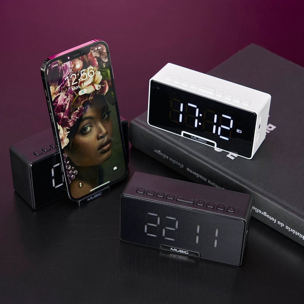Com a área frontal equipada com um display de LED, a caixa de som conta ainda com um compartimento com suporte para celular. Basta puxar a “gaveta” para ter acesso ao compartimento e conectar seu dispositivo para curtir suas músicas favoritas. Além disso, o relógio despertador é um recurso adicional que torna esta caixa de som ainda mais útil no dia a dia.