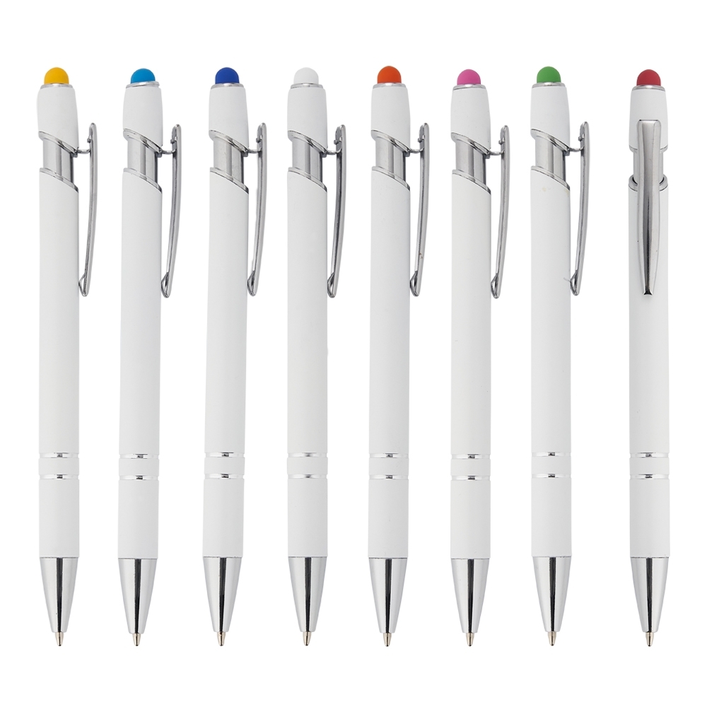 A Caneta de Metal é touchscreen possui carga esferográfica azul e seu acionamento é por clique. Possui Clip metálico.