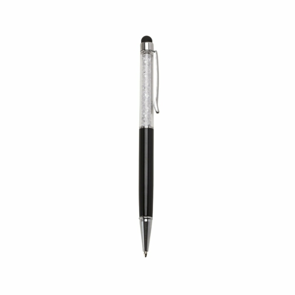 Caneta Metal Touch Screen com detalhes em cristal, carga esferográfica azul e acionamento por rotação.