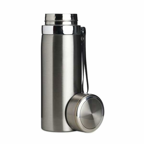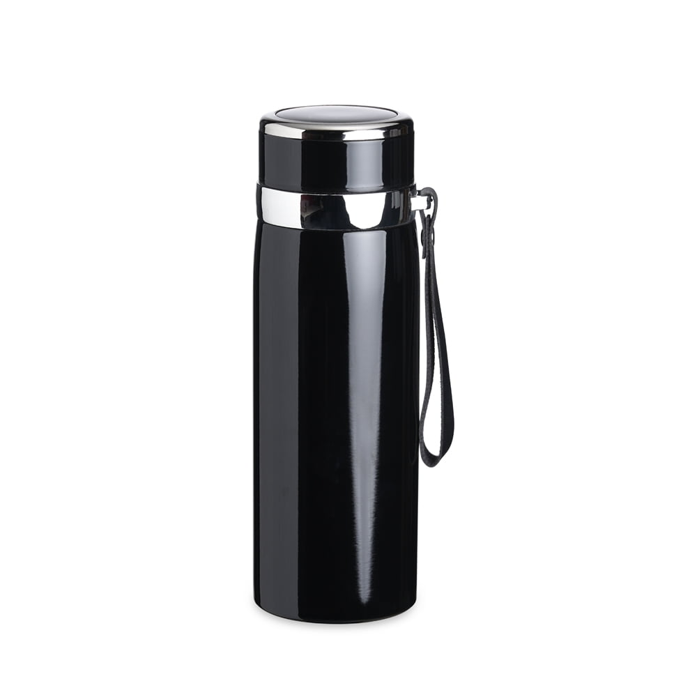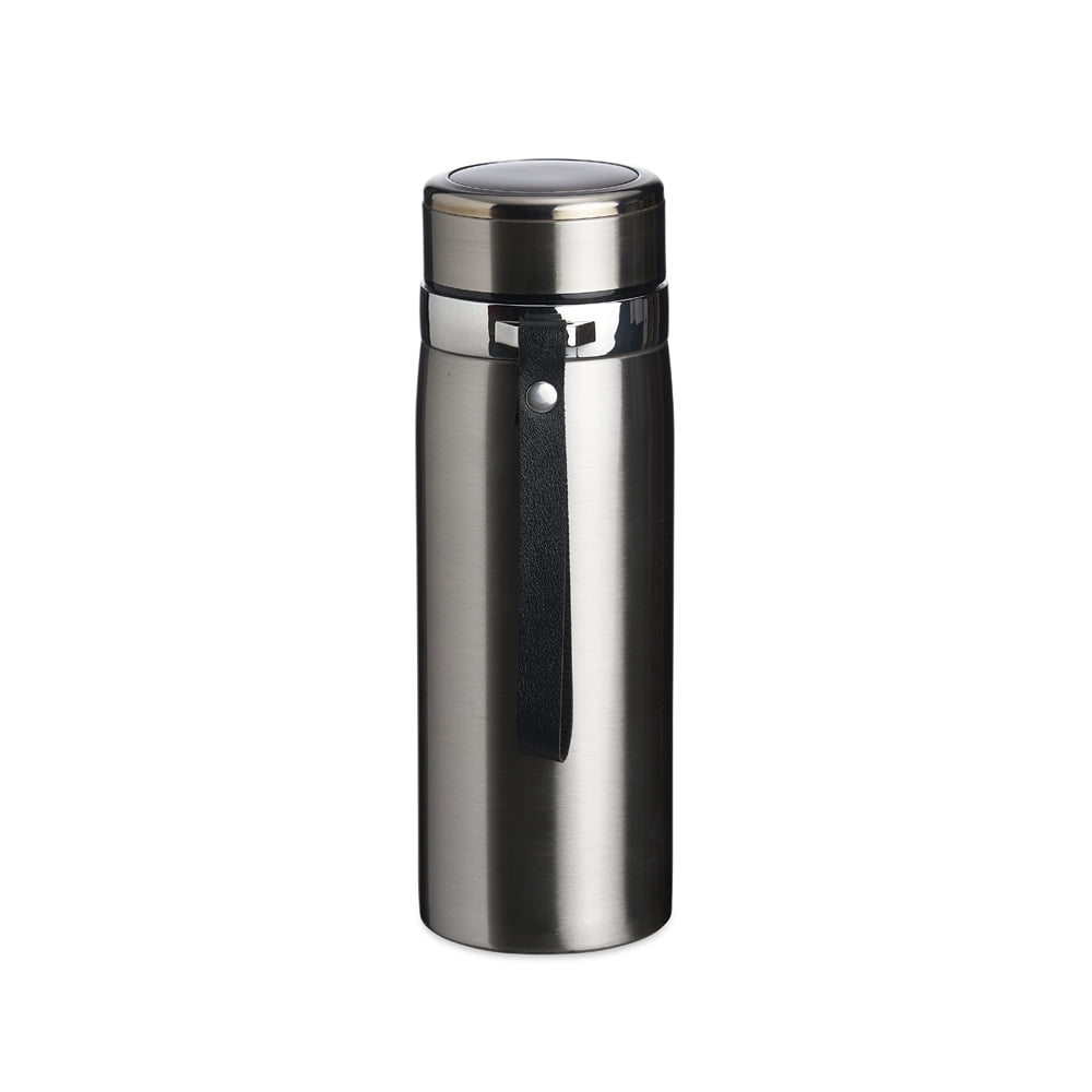 A Garrafa térmica Inox de 800ml possui parede dupla. Possui também uma tampa plástica revestida em Inox com borracha para vedação, que evita o vazamento do líquido e preza pela temperatura da bebida. Para ficar ainda mais completa, possui infusor e alça em couro sintético para transporte.