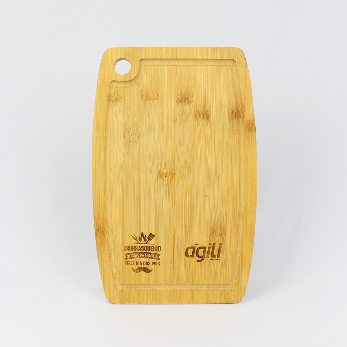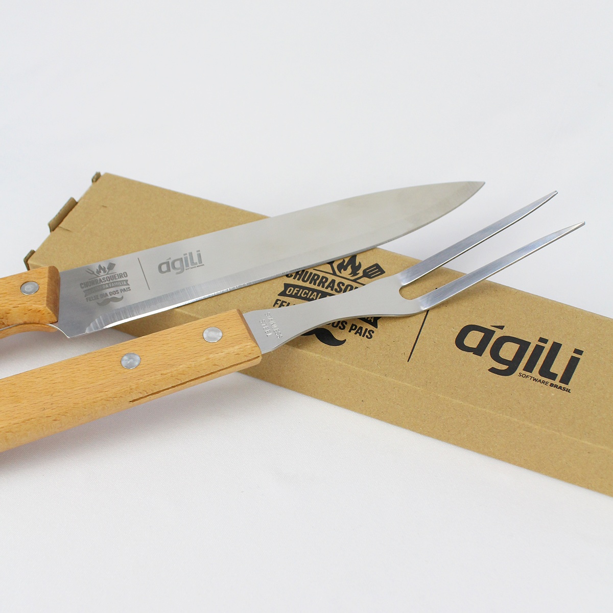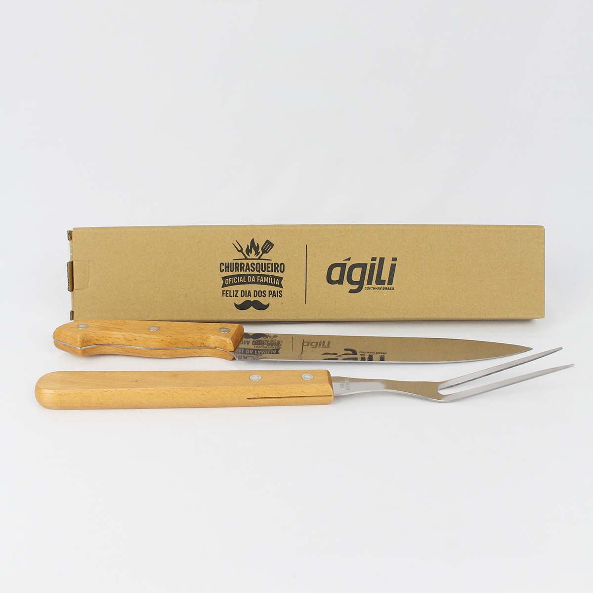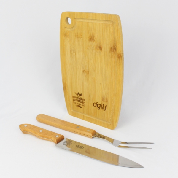 Além do mais, você pode personalizar as peças do Kit Churrasco e a tábua com o logo da sua empresa.