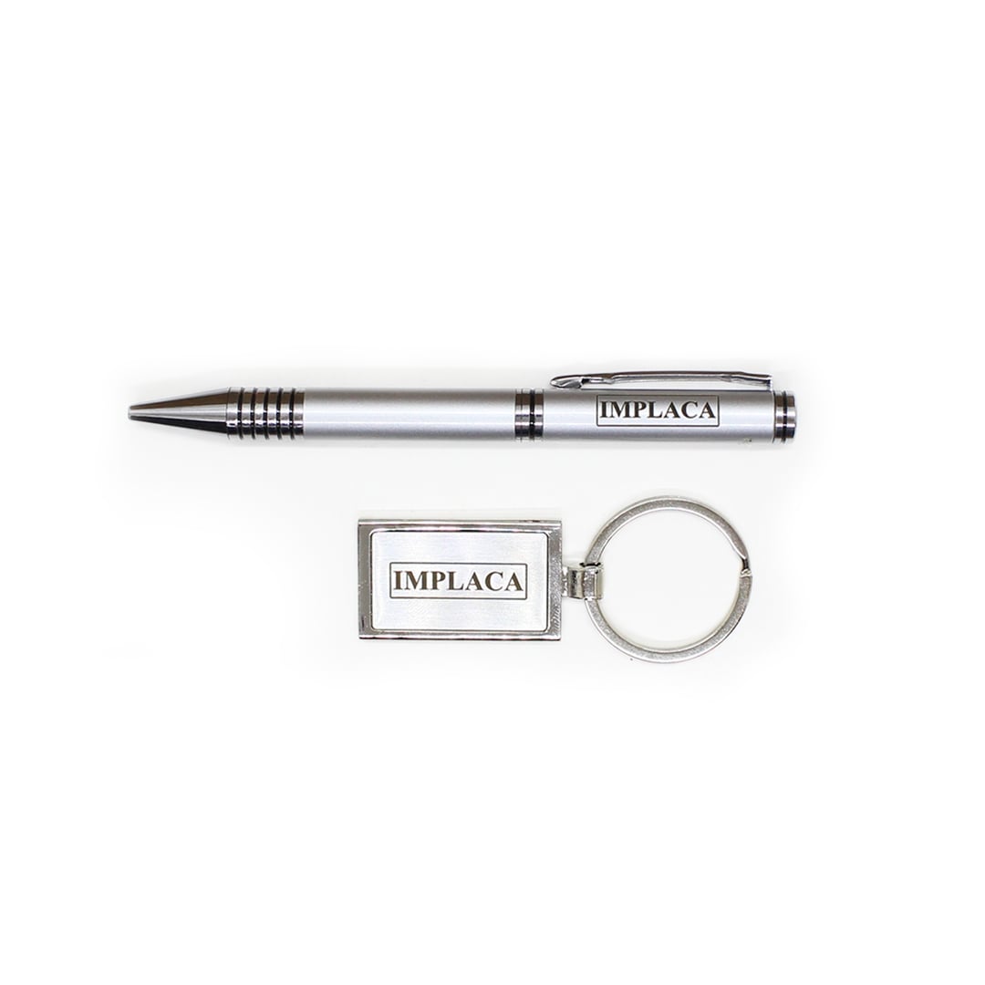 A Caneta em Metal inclusa no kit possui carga esferográfica azul e seu acionamento é por rotação. Acompanhando-a, o Chaveiro em Metal possui um formato retangular, uma placa central ideal para gravação personalizada e é complementado por uma argola.