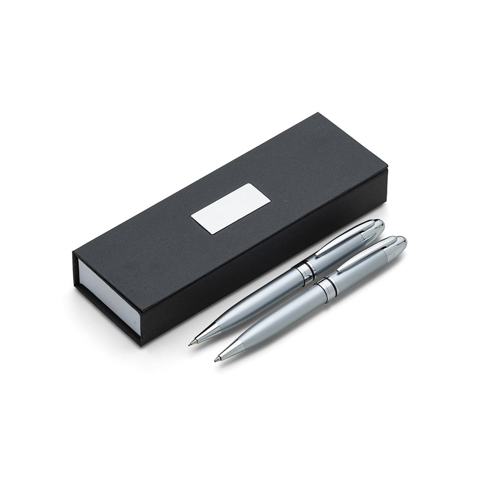 O Kit Executivo Conjunto Caneta e Lapiseira é ideal para presentar clientes sofisticados. A Caneta e a Lapiseira possuem clip metal e anel central possui: anel fino prata, anel preto fino e um anel maior prata com relevo. São acionadas por giro.