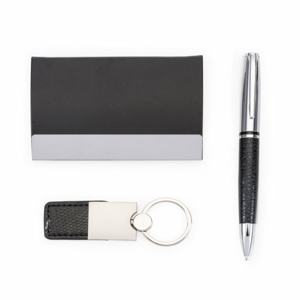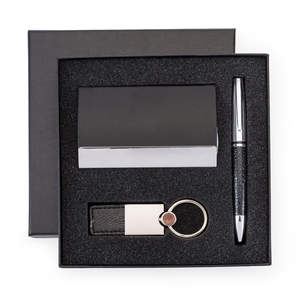 O Kit Executivo Personalizado possui caneta metal brilhante com detalhe couro sintético preto, porta cartão em couro sintético e chaveiro metal fosco. A Caneta possui clip metal e anel central preto e é aciona por giro. O Porta Cartão tem detalhes metálicos brilhantes e parte revestida com veludo, seu fechamento é a imã. Já o Chaveiro possui detalhe inferior emborrachado e suporte da argola giratório brilhante.