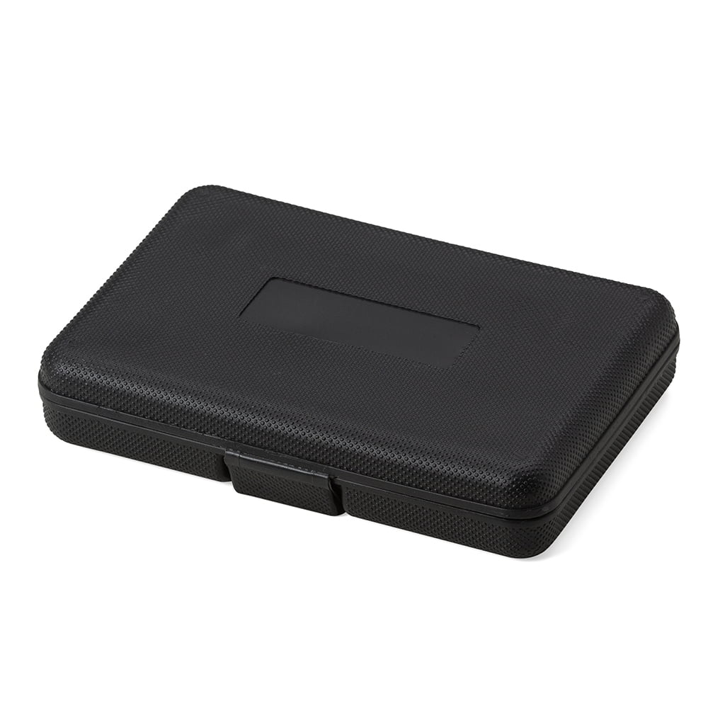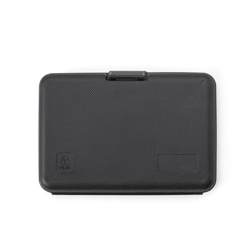 – 1 (uma) Maleta plástica com detalhe retangular no centro frontal e verso com o detalhe na lateral inferior, possui texturização no estojo e uma trava superior.
