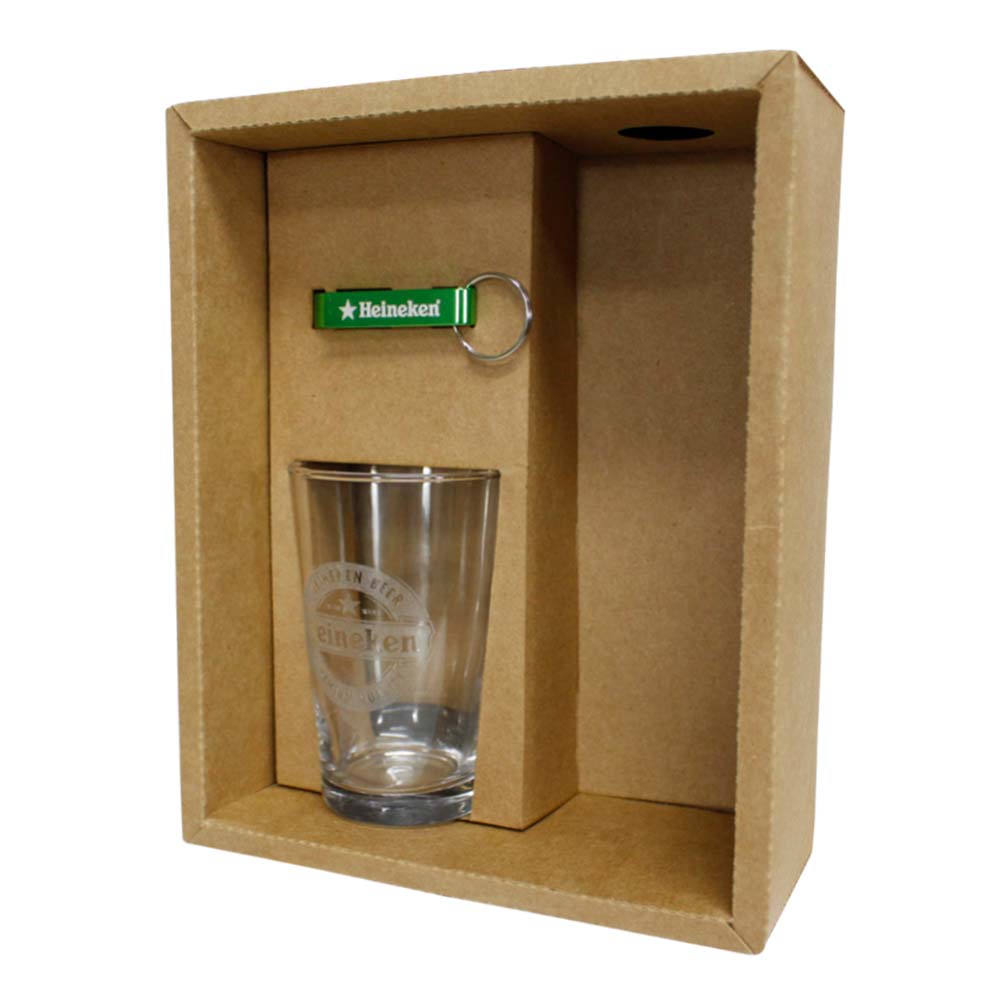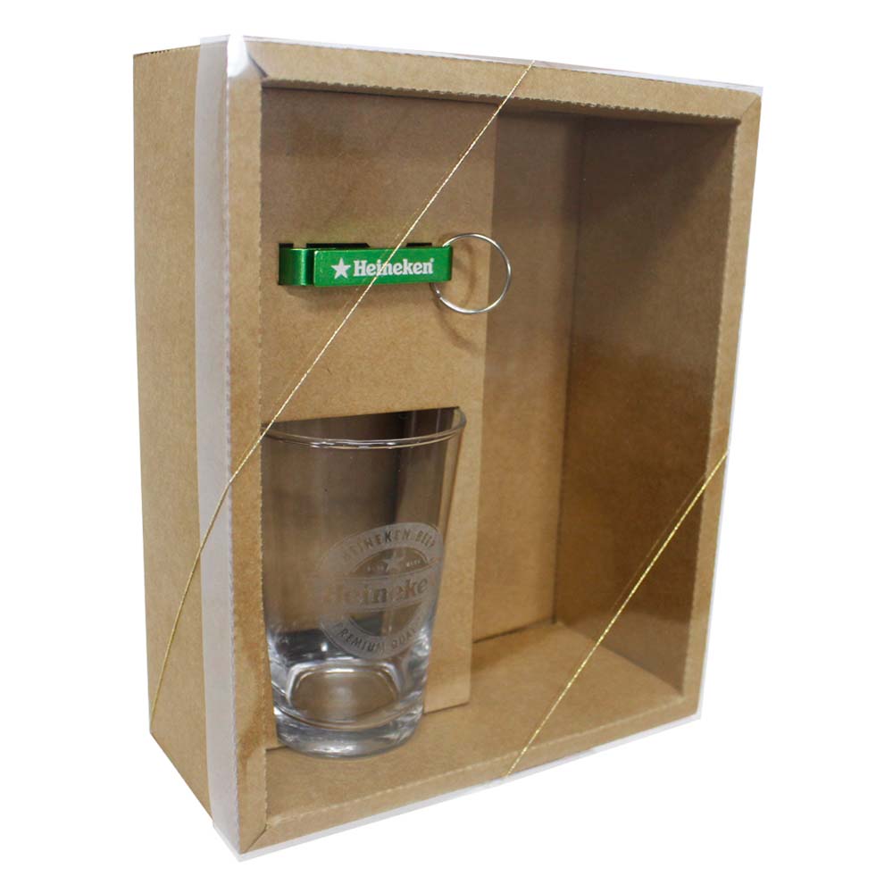 Todos os itens personalizados a laser e acondicionados em uma caixa kraft com tampa de acetato transparente.