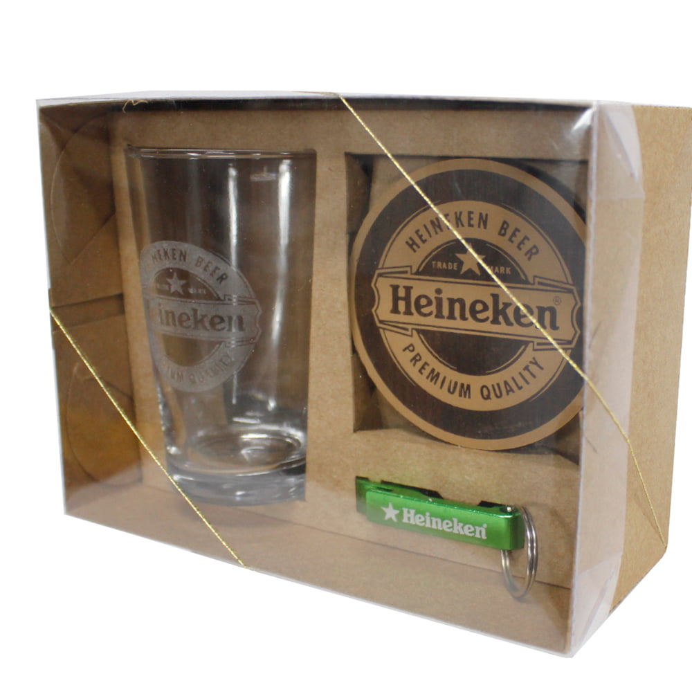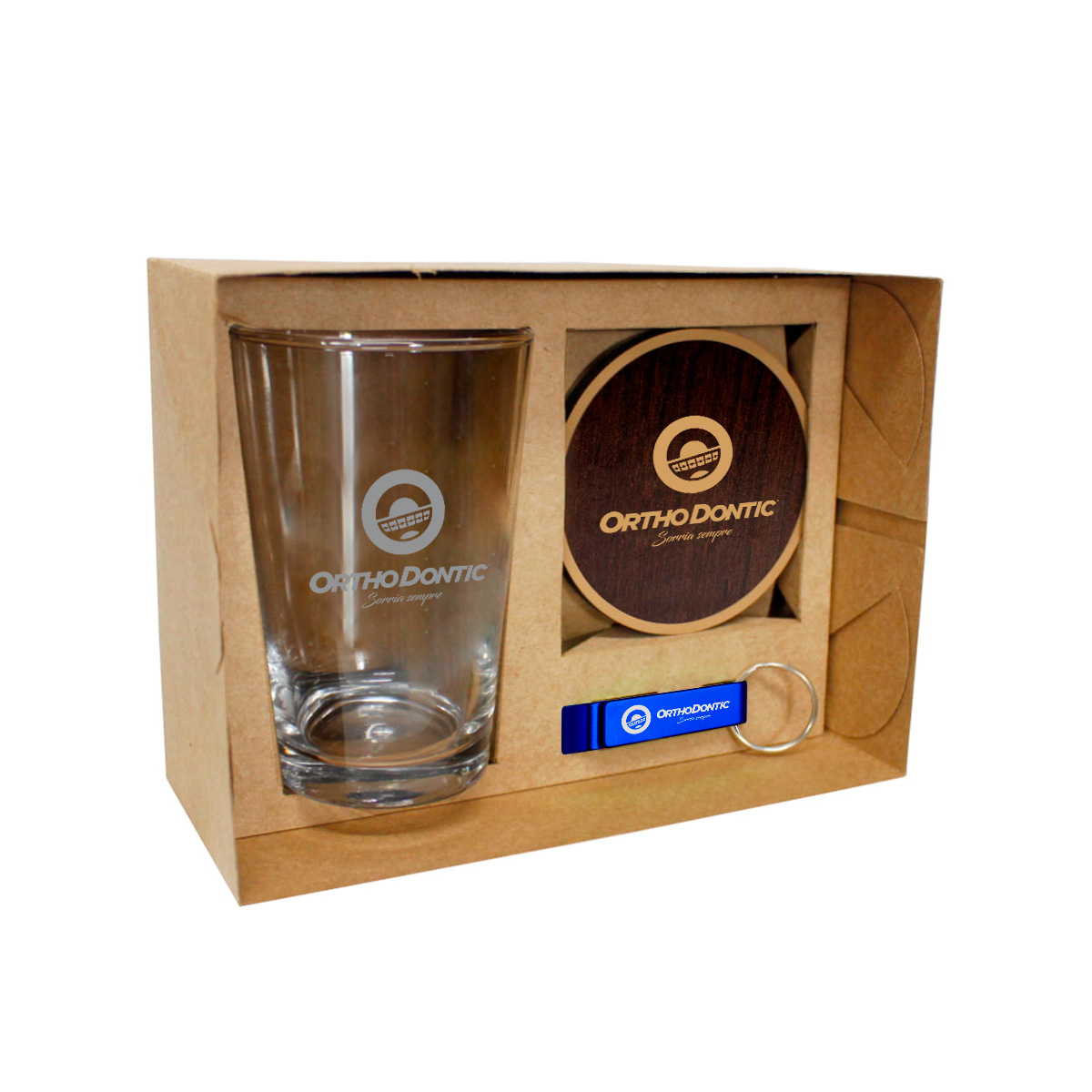 Todos os itens personalizados a laser e acondicionados em uma caixa kraft com tampa de acetato transparente.