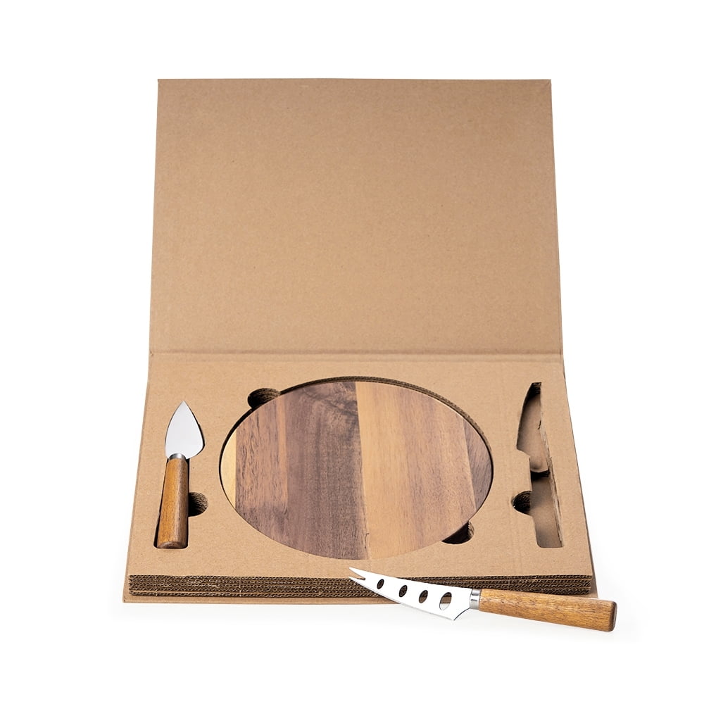 A Tábua com orifício para encaixe. Todos os itens vem acondicionados em um estojo Kraft com encaixe para os utensílios.