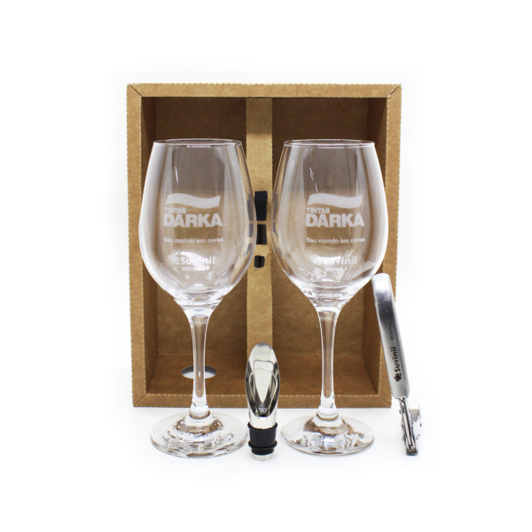Além disso, você pode personalizar as 4 (quatro) peças do Kit Vinho com a logo da sua empresa através da gravação a laser.