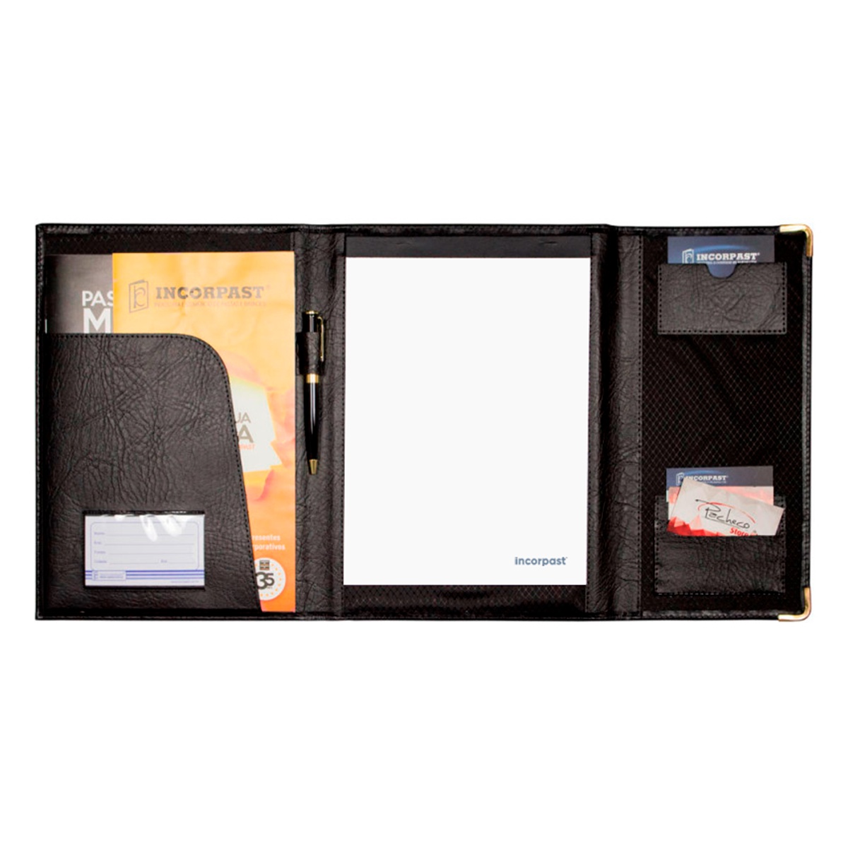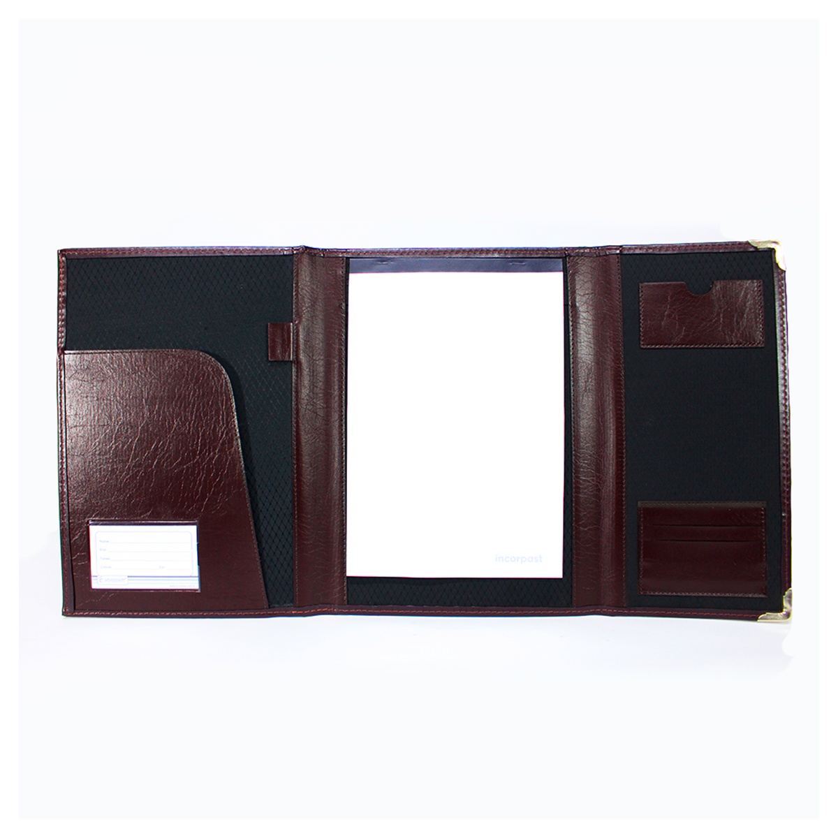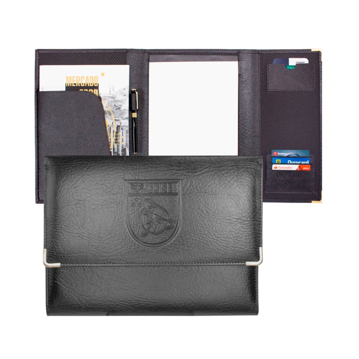 | Características | • Produto Artesanal Fabricado no Brasil • Revestimento em Material Sintético • Costura Dupla • Almofadada • Visor de Identificação • Divisões internas • Porta Caneta • Porta Cartões • Suporte para Bloco • Fechamento em Aba |