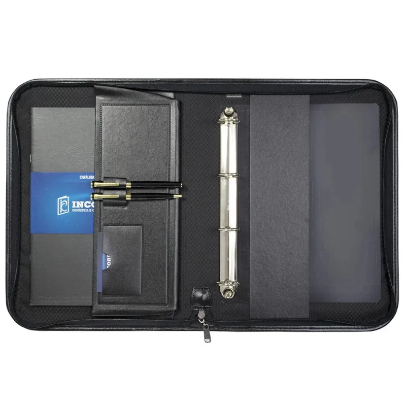 A Pasta Fichário em Couro Sintético Incorpast foi criada com o objetivo de auxiliar sua utilização, com a argola removível para que você possa retira-la no momento de utilização. Fabricada em Couro Sintético de primeira linha a Pasta Fichário em Couro Sintético Incorpast possui 2 porta canetas, 1 porta cartão e 1 bolsa interna para livro ou revista, com fechamento a zíper. Você pode adquirir Pasta Fichário em Couro Sintético Incorpast nas opções: 16441 com ferragem 4 argolas ou 16442 sem ferragem. Personalize sua Logo em baixo relevo ou serigrafia, leve essa facilidade para seus clientes!