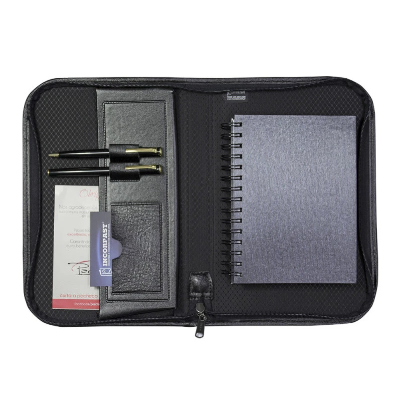 A Pasta Universitária Média Incorpast foi desenvolvida para facilitar o transporte de blocos, agendas, cadernos e etc. Fabricada em Couro Sintético de primeira linha a Pasta Universitária Média Incorpast possui 2 porta canetas, 1 bolsa interno e 1 porta cartão, com fechamento a zíper. Você pode adquirir sua Pasta Universitária Média Incorpast em duas opções de Lombada: 1650 com Lombada de 2,5cm ou 1660 com lombada de 5cm. Personalize sua Logo em baixo relevo ou serigrafia, leve essa facilidade para seus clientes!
