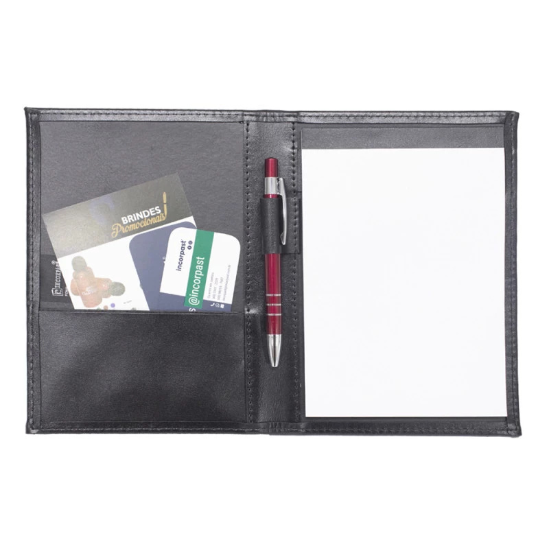 | Características | • Produto Artesanal Fabricado no Brasil • Revestimento em Couro Sintético • Costurado • Almofadado • Suporte para bloco • Bolso interno • Suporte porta caneta • Não acompanha bloco |