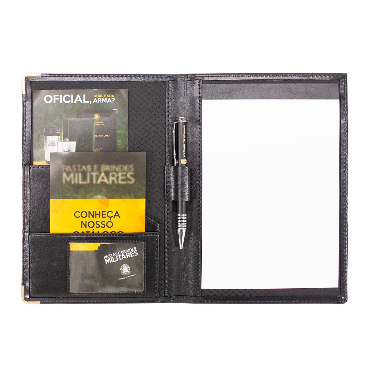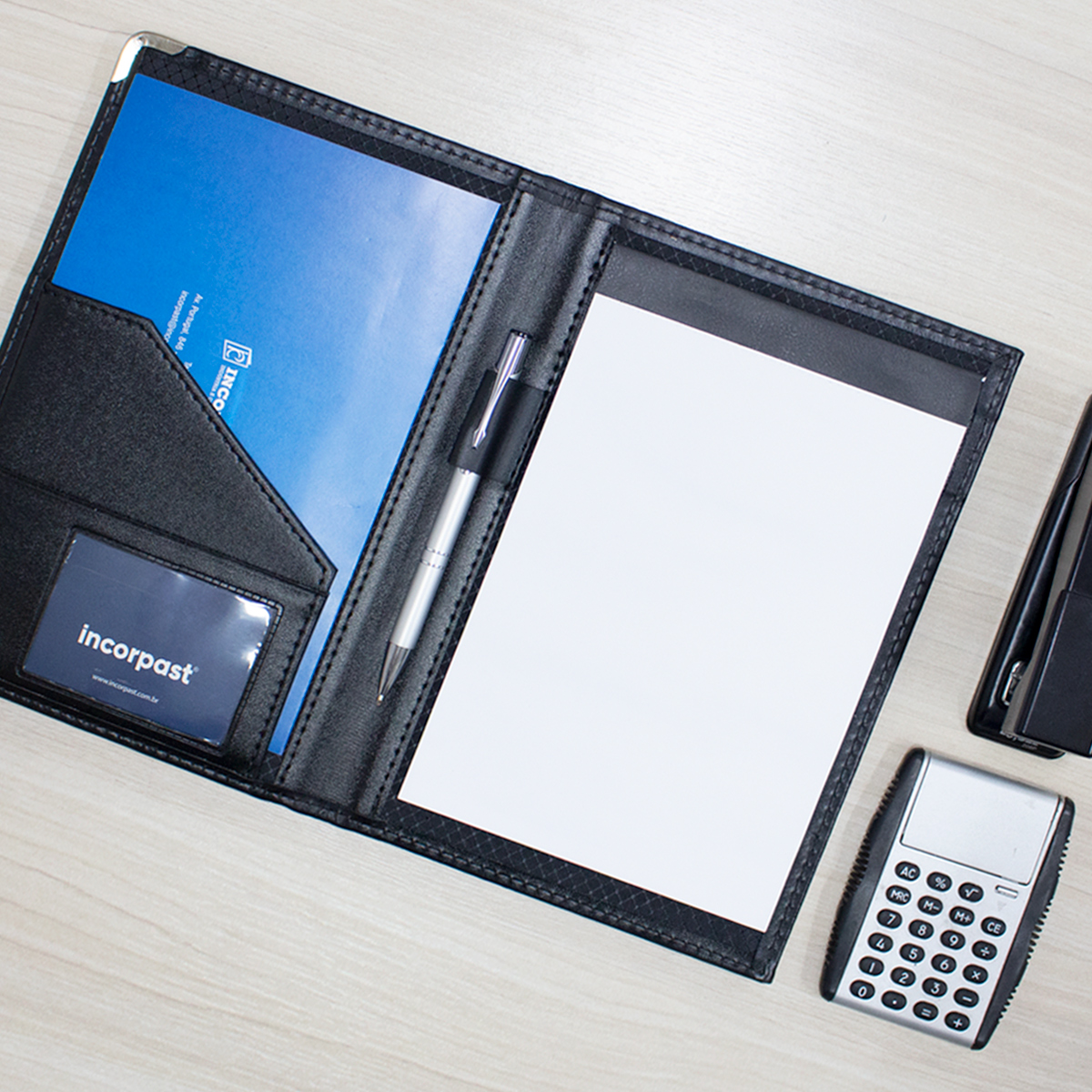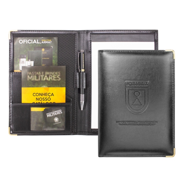 Características• Produto Artesanal Fabricado no Brasil • Revestimento em material sintético; • Costurado • Almofadado • Suporte para bloco • Bolso interno com visor de identificação • Suporte porta caneta • Cantoneira de Metal • Com Bloco de 50 folhas