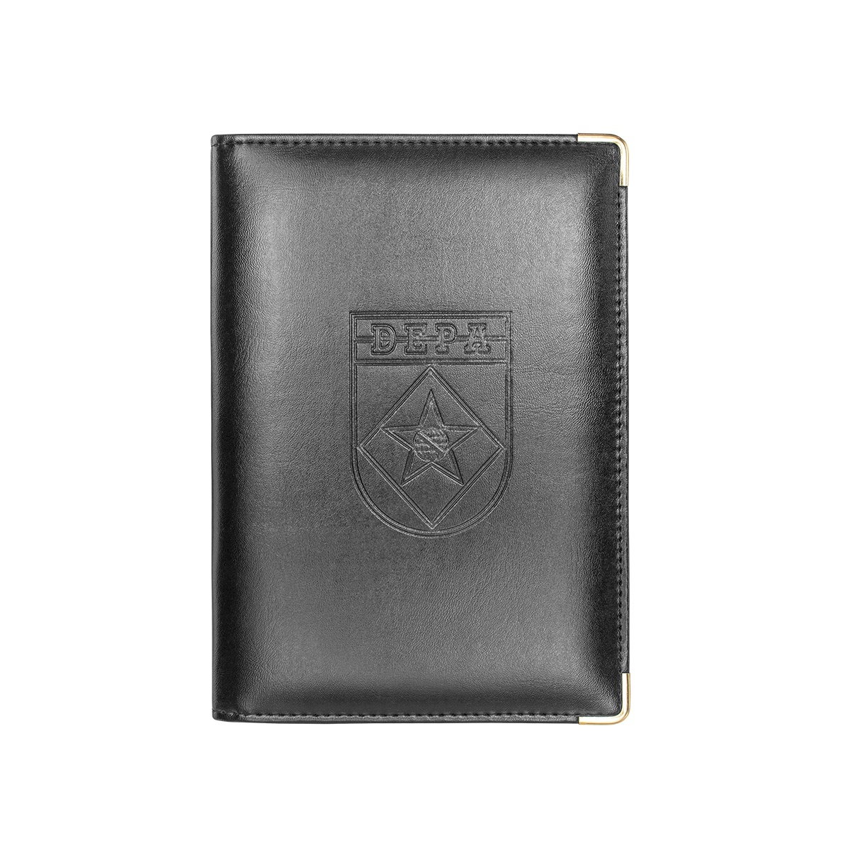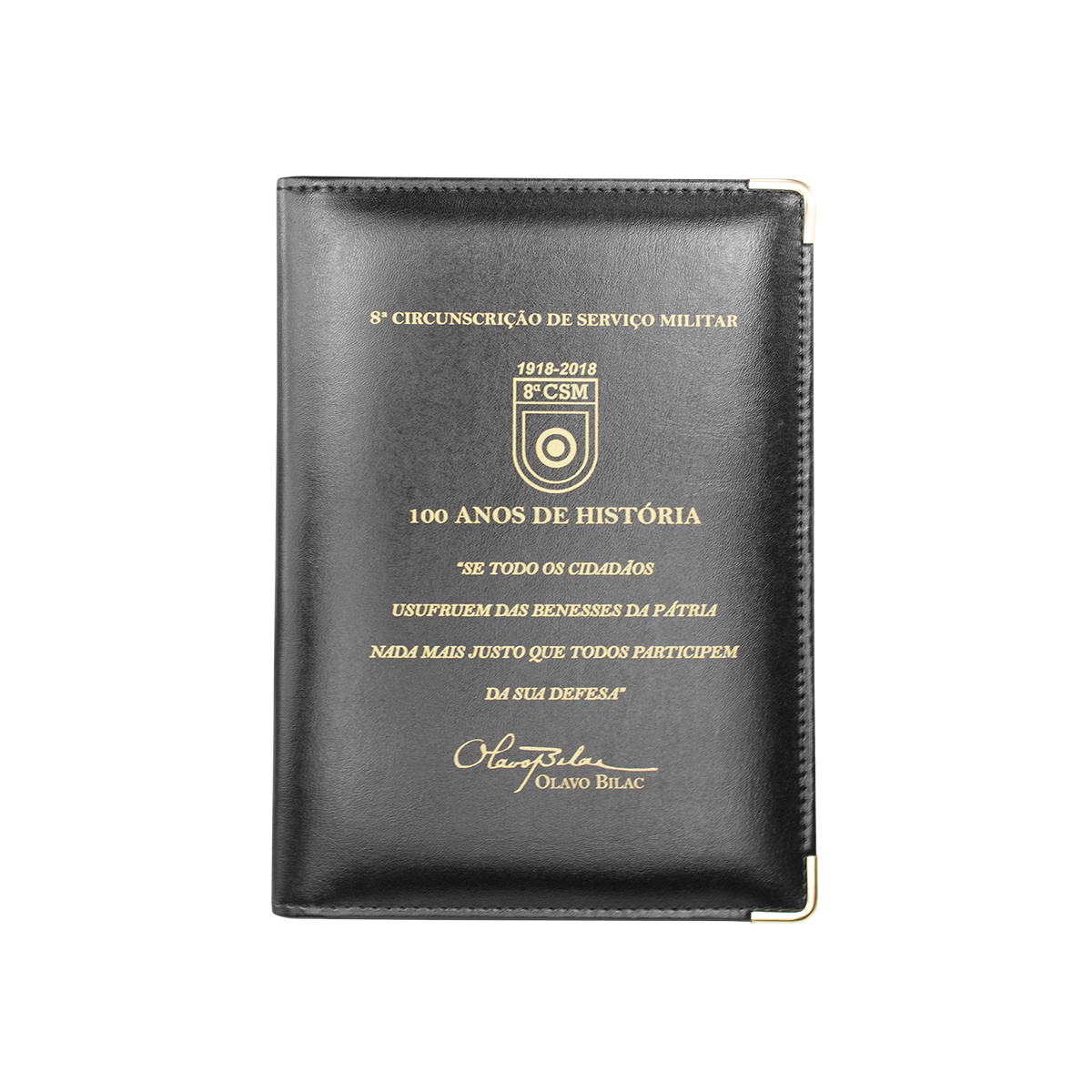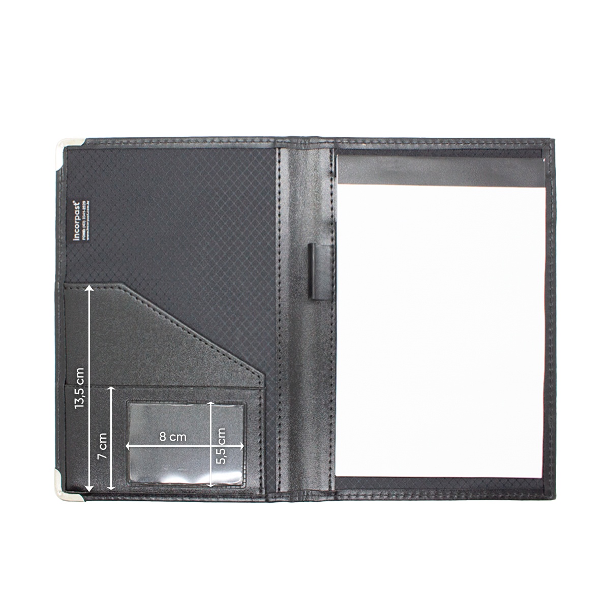 Características• Produto Artesanal Fabricado no Brasil • Revestimento em material sintético; • Costurado • Almofadado • Suporte para bloco • Bolso interno com visor de identificação • Suporte porta caneta • Cantoneira de Metal • Com Bloco de 50 folhas