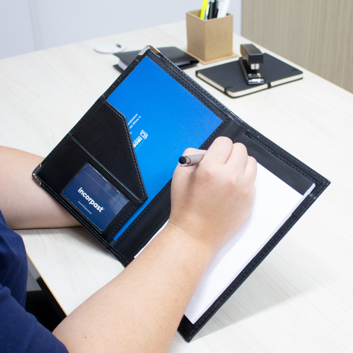 Produzido com acabamento cuidadoso e estrutura reforçada, o Porta Bloco em Couro Sintético oferece durabilidade e um visual profissional que valoriza a apresentação. Seu design inteligente inclui espaços dedicados para identificação e escrita, tornando-o uma escolha eficiente para quem busca organização com praticidade em qualquer ambiente corporativo.
