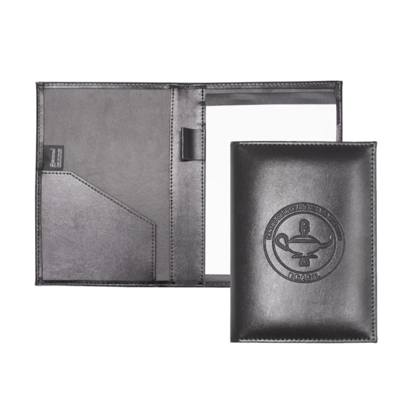| Características | • Produto Artesanal Fabricado no Brasil • Revestimento em Couro Sintético • Costurado • Almofadado • Suporte para bloco • Bolso interno • Suporte porta caneta • Não acompanha caneta |