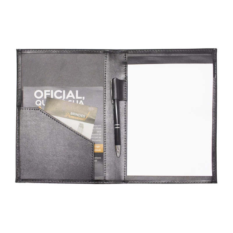 Produzido com revestimento em couro sintético de alta qualidade, o modelo é costurado e almofadado, oferecendo maior durabilidade, proteção ao bloco de anotações e um acabamento mais estruturado. Seu formato prático facilita o transporte e mantém todos os itens essenciais sempre organizados.